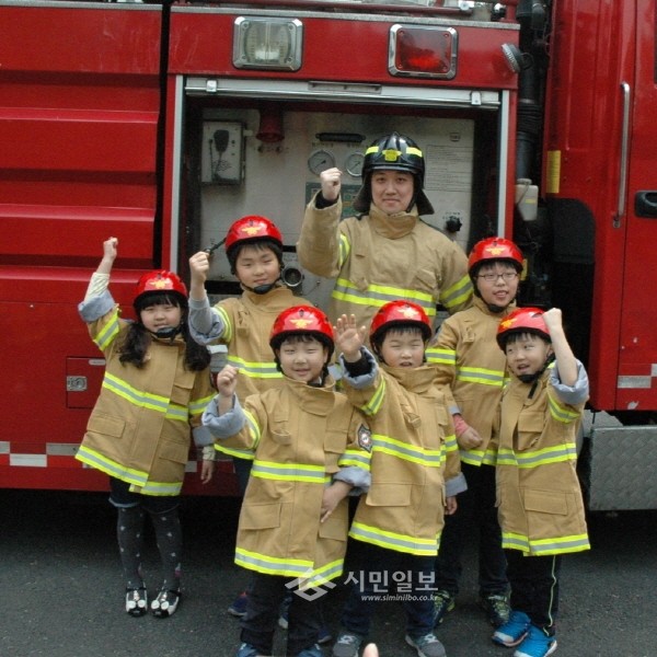 최근 인천 부평소방서가 인천여성문화회관에서 아이·부모 100여명과 함께 가족간의 공감대 형성으로 소방안전에 대한 효과를 극대화하고자 '아이와 함께하는 119안전체험교실'을 운영했다. 사진은 이날 소방복을 입고 현직 대원과 함께 기념촬영을 하고 있는 아이들의 모습.(사진제공= 부평소방서)