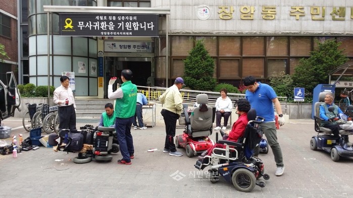 경기 의정부시 장암동 주민센터는 지난 26일 동 주민센터 앞마당에서 거동이 불편한 저소득 장애인을 위한 '장애인보장구 무료수리센터'를 운영했다. 이날 행사에는 의정부시 장애인재활공동체 세움 공동체와 새마을지도자협의회원 등 자원봉사자들이 참여해 휠체어, 목발, 의수, 보조기 등에 대한 전반적인 무상수리를 실시했다. (사진제공=의정부시청)