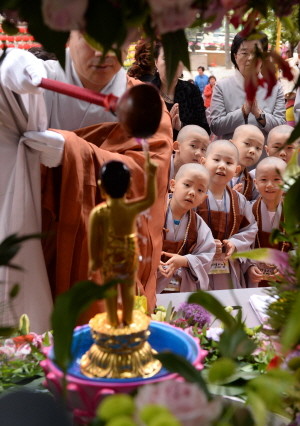 29일 오후 서울 종로구 조계사에서 동자승들이 탄생불(아기부처님)의 형상에 물을 부어 씻기는 '관불 의식'을 지켜보고 있다.