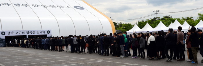 세월호 침몰 14일째인 29일 오전 경기 안산 화랑유원지에 마련된 세월호 희생자 합동분향소에서 조문객들이 차례를 기다리며 길게 줄지어 서 있다.