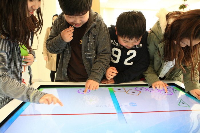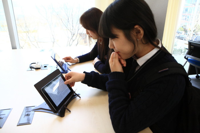 | ▲ 여의디지털도서관의 장서는 상대적으로 적은 2000여권이지만 다양한 전자자료를 사용할 수 있다. 사진은 방문한 학생과 어린이들이 태블릿PC, 대형 터치스크린 화면을 통해 전자책과 멀티미디어 자료를 이용 중인 모습. (사진제공=영등포구청) | ||
