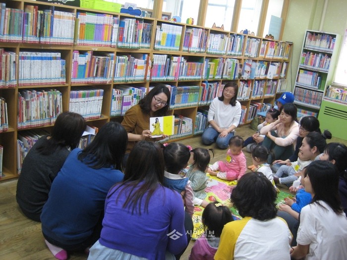 지난 29일 인천 중앙도서관에서는 지역내 영·유아 자녀를 둔 부모와 자녀들을 대상으로 독서권고 프로그램 '엄마와 아가의 즐거운 책 나들이'를 진행했다. 사진은 도서관에 모여앉아 사서가 읽어주는 동화책 내용을 경청하고 있는 부모와 자녀들의 모습.(사진제공=인천시교육청)