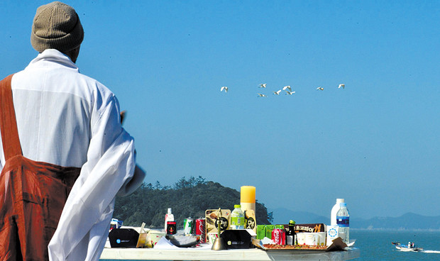 세월호 침몰 사고 15일째인 30일 오전 전남 진도군 임회면 팽목항에서 불임 스님이 100일기도를 하고 있는 가운데 한무리의 새가 바다 위를 날고 있다.