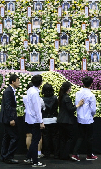 단원고등학교 생존자 학생과 학부모들이 30일 오후 경기 안산시 화랑유원지에 마련된 정부 합동분향소를 찾아 조문하고 있다.