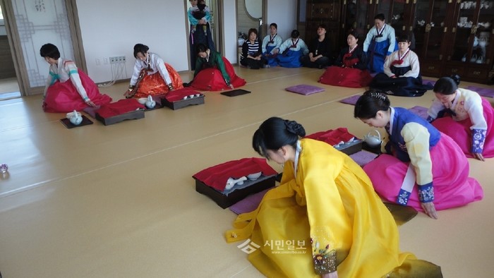 지난달 30일 인천인수초교 본관 4층 예절서당에서 학생들에게 인사예절·언어예절 등 생활속에서 실천해야 할 기본적인 예절과 함께 전통 다도를 가르칠 '예절 명예 교사단'의 수료식이 열렸다. 사진은 이날 한복을 차려입은 '명예 교사단'이 수료식을 진행하고 있는 모습. (사진제공=인천시교육청)