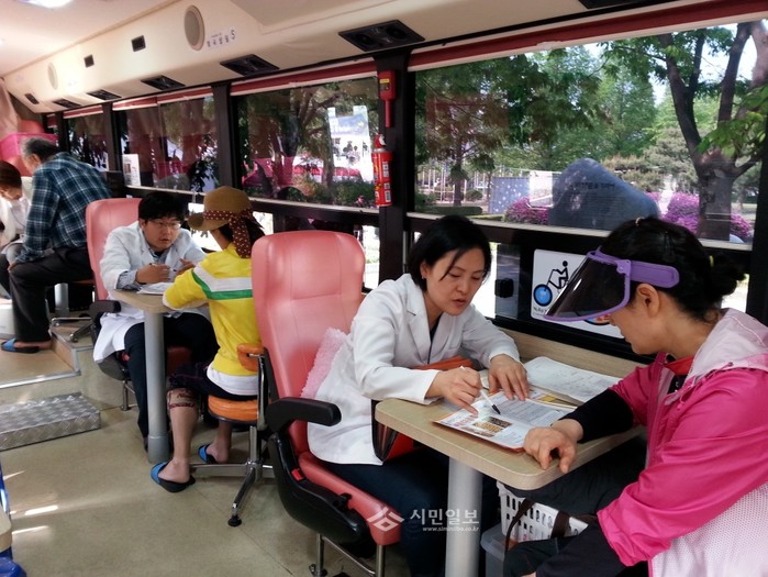 경기 고양시가 2014 고양국제꽃박람회 기간동안 혈압·골밀도·체지방측정기 등의 건강측정장비와 의사 등의 전문상담인력을 갖추고 관람객들에게 무료로 의료서비스를 제공하는 '찾아가는 이동건강버스'를 운영 중이다. 사진은 버스를 찾은 박람회 관객들이 상담 중인 모습. (사진제공=고양시청)