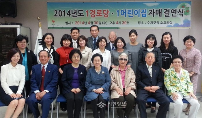 경기 용인시 수지구는 지난 4월30일 구청사 소회의실에서 경로당 9곳과 어린이집 9곳 대표자들이 자리한 가운데 '1경로당-1어린이집 자매 결연식'을 열고 경로당 예절교육, 전통놀이 체험 및 어린이집 재롱잔치, 꽃 달아드리기 등 다양한 사업을 함께 진행하기로 결연 증서에 서명했다. 사진은 이날 행사에 참여한 경로당, 어린이집 대표자와 관계자들의 모습. (사진제공=용인시청)