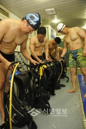 서울 구로소방서는 7일 여름철 집중호우로 인한 안양천 및 도림천 범람 등 수난사고의 발생에 대비해 인명구조 능력을 배가하고 119구조대원의 체력 및 정신력을 강화해 강인한 구조요원을 육성하기 위해 경기 광명시 하안동에 있는 '뉴서울다이빙풀장'에서 현지적응훈련을 실시했다. 사진은 수난구조장비 사용법을 익히고 있는 대원들의 모습. (사진제공=구로소방서)