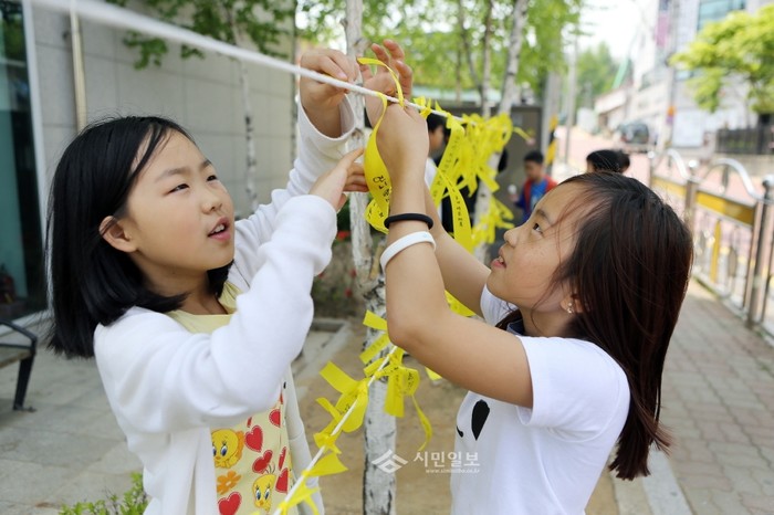 경기 가평군은 연휴기간에도 군청 기록관내 합동분향소를 운영했으며 희생자 가족의 아픔을 함께 나누는 조문객들의 방문을 받았다. 특히 어린 학생들의 발길이 이어졌으며 이날 분향소를 방문한 방문객들은 기적을 바라는 간절한 마음을 담아 노란리본을 매달았다. 사진은 지난 2일 분향소를 방문해 노란리본을 매달고 있는 학생들의 모습. (사진제공=가평군청)