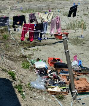 세월호 침몰 사고 22일째인 7일 오전 전남 진도군 임회면 팽목항 유류품보관소 앞에 사고해역에서 발견된 바닷물에 젖은 옷가지와 신발 등이 말려지고 있다.