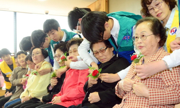 어버이 날을 하루 앞둔 7일 오후 부산 부산진구 적십자회관에서 청소년적십자단(RCY)과 자원봉사원들이 지역 어른신들에게 카네이션 꽃을 달아준 뒤 안마를 하고 있다.