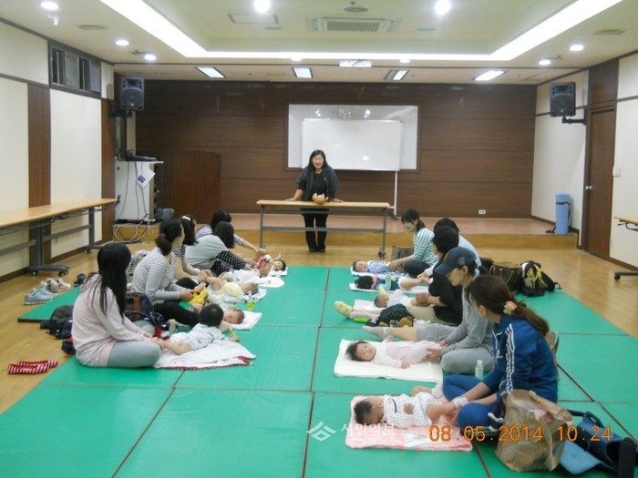 8일 오전 인천 계양구보건소가 출생 후 4~10개월 영아 및 엄마들을 대상으로 아동의 성장발달을 촉진시키고 엄마와의 상호관계를 증진시켜 양육 스트레스를 감소시키기 위해 '아기 마사지 교실'을 운영했다. 사진은 참여자들이 유아마사지 실습을 하고 있는 모습.(사진제공=계양구청)
