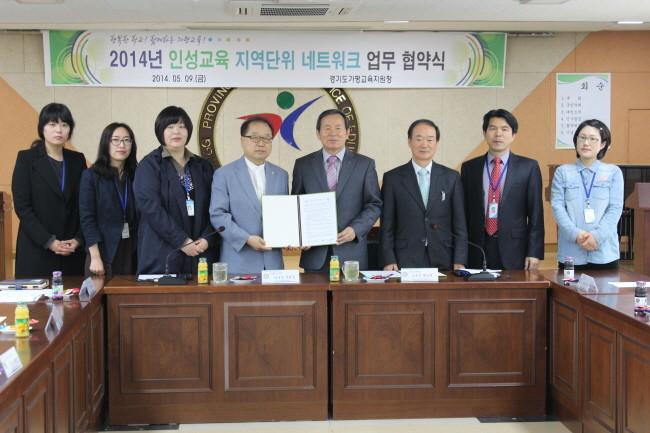 경기 가평교육지원청은 지난 9일 청사내 물회의실에서 '(사)월드유스비전'과 지역내 아동 및 청소년의 인성교육 인프라 구축 및 활성화를 위해 '2014년 인성교육 지역단위 네트워크 업무협약'을 체결했다. 사진은 업무협약식 후 기념사진을 촬영하는 모습. (사진제공=가평교육지원청)