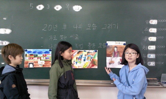최근 경기 부천시 성곡초등학교는 학년별로 내용을 달리해 자신의 꿈과 진로에 대해 고민하고 탐색하는 교육 활동인 '진로 페스티벌'을 개최했다. 사진은 '20년 후의 나의 모습 그리기' 활동에 참가한 아이들의 모습. (사진제공=부천교육지원청)