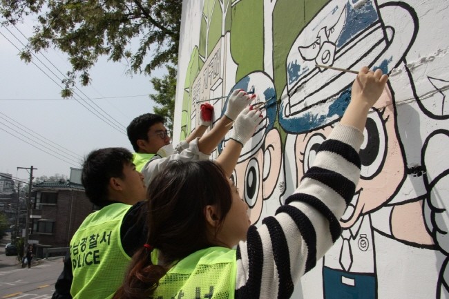 경기 하남경찰서는 지난 9일 하남시 덕풍2동 주민센터 및 주민자치위원회에서 추진하는 벽화그리기 사업에 참여해 경찰관들이 덕풍지구대 풍경그리기 등 벽화그리기에 직접 나섰다. 사진은 경찰의 마스코트 포돌이, 포순이 캐릭터를 그리고 있는 모습. (사진제공=하남경찰서)