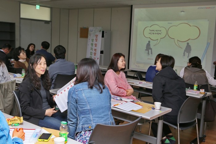 지난 9일 금천구가 자살의 위험성이 상대적으로 높은 취약계층을 자주 접하는 가정방문간호사, 사회복지공무원, 복지상담사 등 50여명을 대상으로 일상생활에서 자살위험신호를 발견하고 자살을 예방하기 위한 '생명사랑지킴이' 양성 교육을 실시했다. 사진은 이날 배운 내용을 토대로 상담 실습 중인 참여자들의 모습.(사진제공=금천구청)