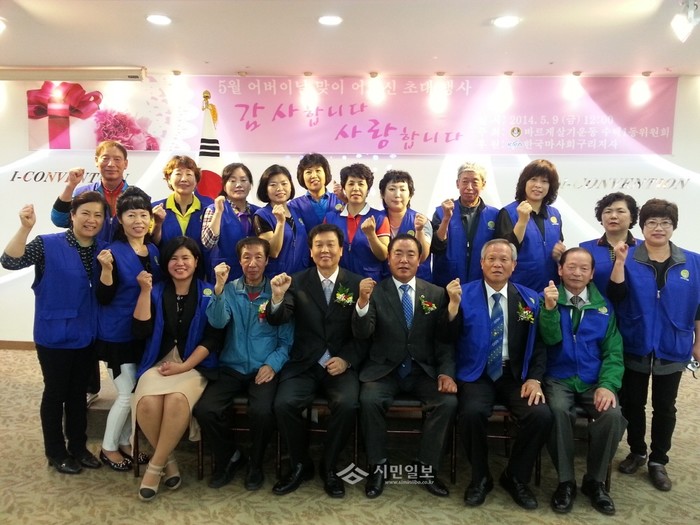 최근 경기 구리시가 가정의 달을 맞아 지역내 노인 130여명을 아이컨벤션센터로 초청해 음식을 대접하고 감사의 마음을 전달하는 등 지역 봉사활동을 펼쳤다. 사진은 이날 행사에 참가한 자원봉사자들과 관계자들이 기념촬영을 하는 모습.(사진제공=구리시청)