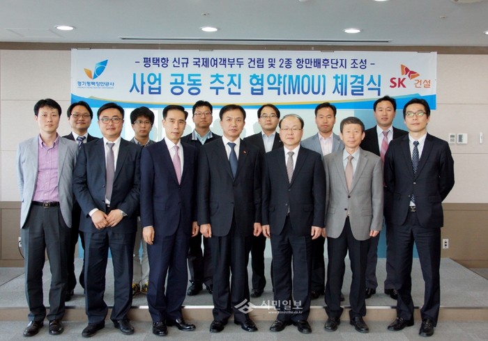 경기 평택항만공사와 ㈜SK건설은 12일 평택항 마린센터에서 '평택항 신규 국제여객부두 건립 및 2종 항만배후단지 조성 공동 사업' 추진과 관련해 상호 공동추진 협약을 체결했다. 이날 체결식은 2013년 12월31일 해양수산부의 제2차 항만배후단지 개발 종합계획 변경시 반영된 2종 항만배후단지 개발을 추진해 국제여객의 편의증진을 위해 이뤄졌다.(사진제공=경기평택항만공사)