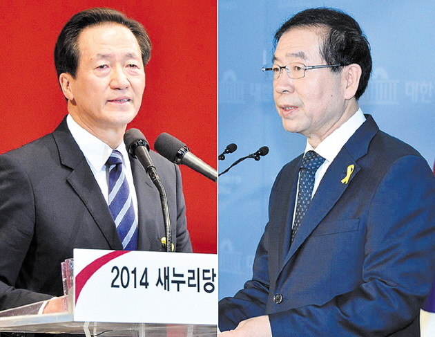 6.4 지방선거 서울시장 후보 대진표가 최종 확정됐다. 사진은 새누리당 서울시장 후보자 선출대회에서 수락연설하는 정몽준(왼쪽) 의원과 국회 정론관에서 기자회견하는 새정치민주연합 소속 박원순 서울시장.