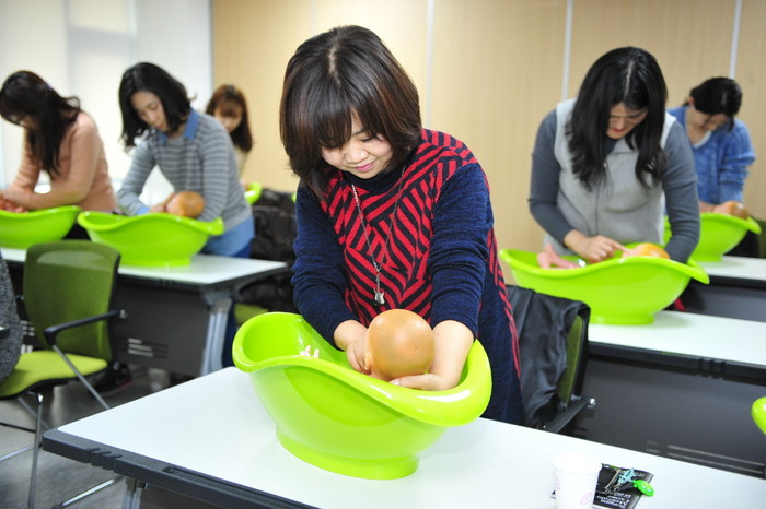 | ▲ 보건지소를 방문한 예비맘(Mom)들이 올바른 아기목욕법 습득을 위한 실습을 하고 있는 모습. | ||