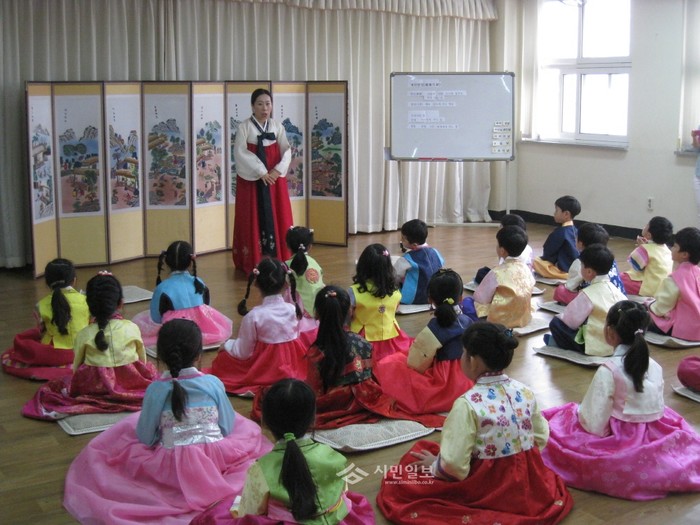 지난 12일 경기 부천 상동초등학교가 올바른 예절을 생활화하고 어린이들의 바른 성품을 기르기 위해 전교생을 대상으로 전통예절교육을 실시했다. 사진은 한복을 차려입은 학생들이 학부모 명예교사에게 예절교육을 받고 있는 모습. (사진제공=부천교육지원청)