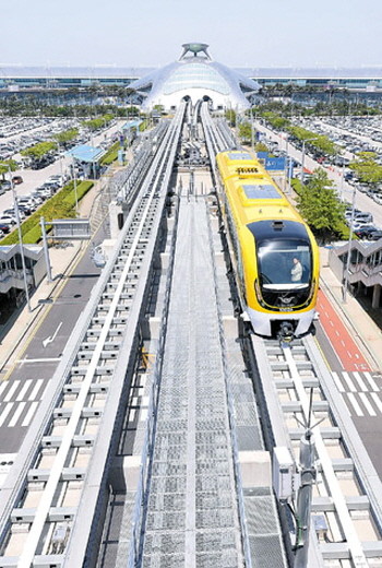 14일 오후 인천국제공항 자기부상열차가 공항에서 용유역까지 시운전을 선보이고 있다. 도시철도차량시험인증센터로부터 성능 인증을 받은 현대로템은 “이날 선보인 자기부상열차는 국내에서 처음으로 운행되는 것이며, 2달간의 시운전을 거쳐 오는 7월부터 인천국제공항역에서 용유역까지 6.1 km 구간에서 운행될 예정”이라고 밝혔다.