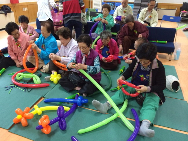 지난 12일 경기 고양시 일산서구 보건소가 지역내 치매노인들과 주민들을 대상으로 치매를 예방하고 여가시간을 활용할 수 있는 '치매예방 풍선아트'를 열고 풍선에 직접 바람을 넣고 모양을 만드는 등의 활동을 통해 치매를 예방하는 시간을 보냈다. 사진은 이 날 참여자들이 풍선으로 다양한 모양을 만드는 모습(사진제공=고양시청)