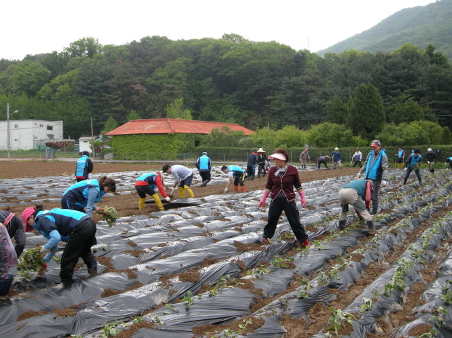 지난 12일 경기 양주시시설공단은 천생연분마을에서 마을주민과 공단직원 등 50여명이 참여해 고구마 모종 심기 등 농촌일손돕기 자원봉사활동을 실시했다. 사진은 이날 봉사활동에 참여한 관계자들과 마을주민들이 농촌 일손 돕기를 하고 있는 모습.(사진제공=양주시청)