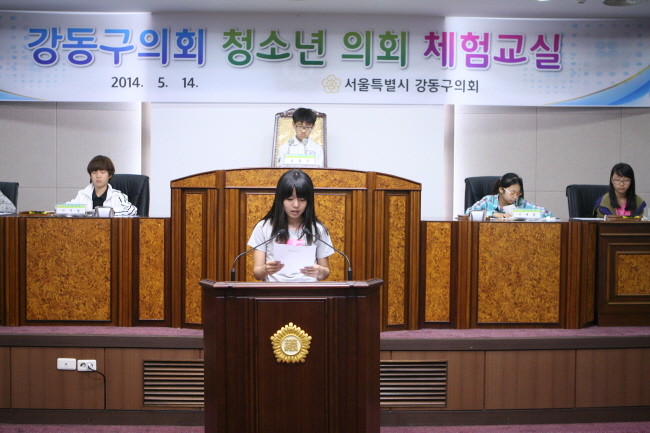 14일 오후 서울 강동구의회에서 강동초등학교 6학년 학생들 26명을 대상으로 의장실과 중회의실, 상임위원회실 등을 견학 후 청소년의회 체험교실을 열어 구의회의 역할에 대해 교육했다. 사진은 본회의장에서 공무원역할을 체험하고있는 학생들의 모습.(사진제공=강동구의회)