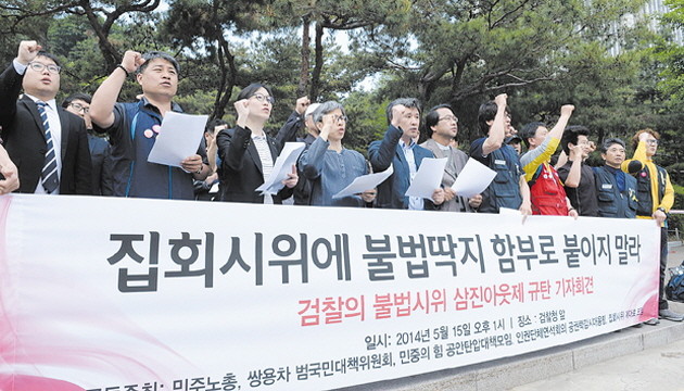 를 규탄하는 기자회견을 열고 있다. 서울중앙지검이 발표한 ‘불법시위사범 삼진아웃제’는 집시법 위반 및 집회, 시위 현장에서의 공무집행 방해, 교통방해, 폭력행위 등에 대해 단순 가담자라도 5년 이내 벌금 이상의 동종 전력이 2회 이상 있거나 동종 전력이 총 4회 이상 있는 경우, 집행유예 기간 중에 위법을 저지른 경우 정식 재판에 회부하는 것이다.