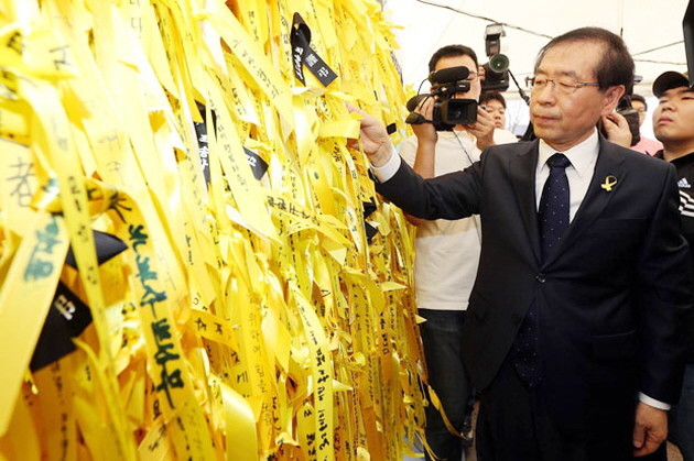 '6.4 지방선거 출마를 선언한 박원순 새정치민주연합 서울시장 후보가 15일 오전 서울광장에 마련된 세월호 침몰사고 희생자 분향소를 찾아 노란 리본에 희생자를 추모하는 문구를 담아 매달고 있다.