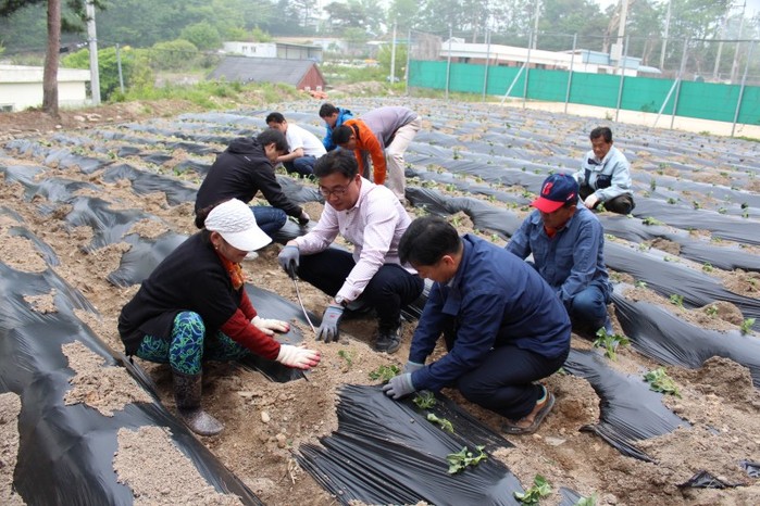 경기 여주시 시설관리공단은 최근 종합운동장내 유휴지에 고구마를 경작하고 지역 소외계층에 전달하기로 하고 인근 지역주민과 공단 임직원들이 직접 참여해 비료살포, 이랑조성, 배토작업 등을 통해 고구마를 식재했다. (사진제공=여주시청)