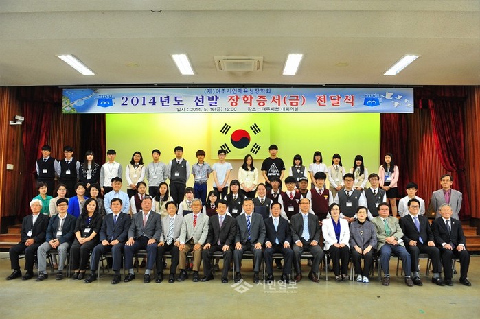 (재)여주시인재육성장학회는 지난 16일 여주시청 대회의실에서 2014년도에 선발된 117명의 장학생에게 장학증서를 전달했다. 선발된 장학생에게는 초등학생 60만원, 중학생 80만원, 고등학생 100만원, 4년제 대학생 700만원, 2~3년제 대학생 300만원의 장학금이 지급될 예정이다. 사진은 참석자들이 기념촬영을 하는 모습. (사진제공=여주시청)