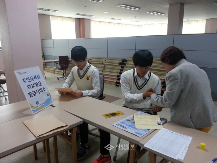 최근 경기 의정부시 기능1동 주민센터에서는 '주민등록증 학교방문 발급서비스'를 통해 의정부고등학교 등 4곳을 직접 방문해 신규 주민등록증 발급대상자에게 주민등록증을 발급해 주었다. 사진은 이날 서비스를 이용하고 있는 학생들의 모습. (사진제공=의정부시청)