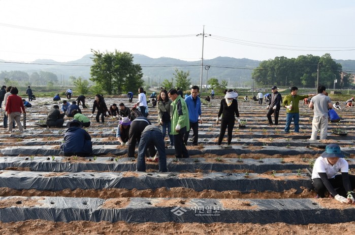 21일 경기 양주시가 고읍지구 대체농지 내 목화밭 조성지에서 목화축제의 기반을 조성하고 섬유패션도시로서의 이미지를 제고하기 위해 시민, 자원봉사자, 공무원 등 400여명이 참석한 '2014 시민과 함께하는 목화심기 체험행사'를 열어 4만2000여주의 목화를 심었다. 사진은 이날 행사의 참여자들이 목화를 심고있는 모습. (사진제공=양주시청)