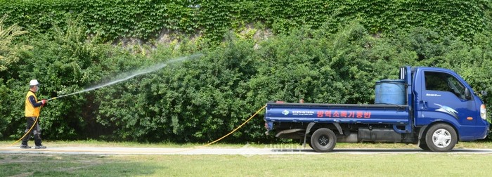최근 진드기 활동시기가 도래함에 따라 공원, 풀밭 등 야외활동에 주의가 요구되고 있다. 21일 오전 대구시 남구 신천둔치 일대에서 남구보건소 방역담당자가 살인 진드기 방역소독을 하고 있다. 남부 보건소 관계자는 살인 진드기는 현재까지 치료제 및 예방백신이 없어 물리지 않는 것이 최선의 예방이므로 야외작업 활동시 피부노출을 최소화하는 등 예방수칙을 철저히 준수할 것을 당부했다.