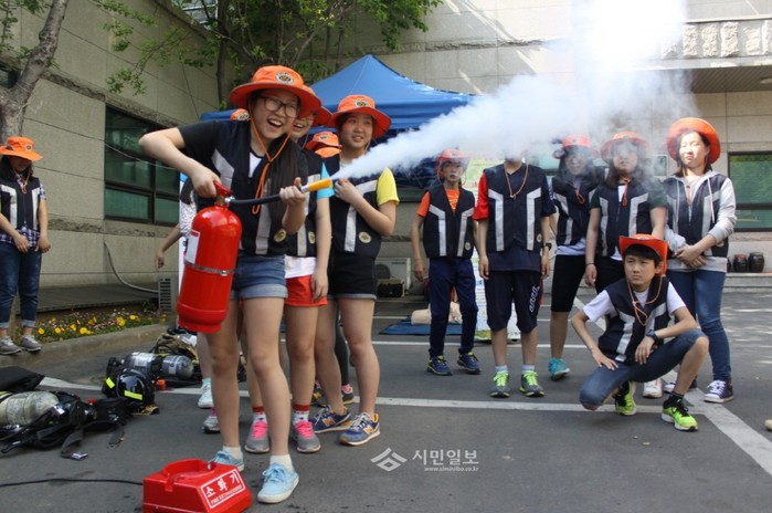 지난 21일 인천시 서부소방서가 2층 체육관에서 '2014년도 한국119소년단 연합발대식'을 개최하고 '소소심 체험교육' 비롯해 각종 체험프로그램을 진행했다. 사진은 이날 연합발대식에 참가한 단원들이 소화기를 직접 사용해보고 있는 모습. (사진제공=인천서부소방서)