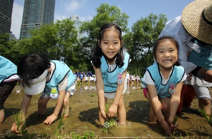 지난 21일 서울 강남구가 양재천 벼농사 학습장에서 지역내 유치원, 초등학교를 다니는 아동 300여명과 함께 전통방식으로 모를 심어보는 농촌체험행사를 개최했다. 사진은 이날 모내기체험에 참가한 아동들이 모를 심고있는 모습. (사진제공=강남구청)