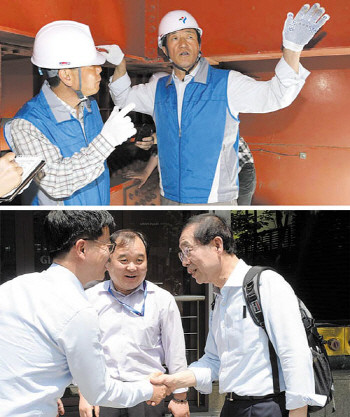 새누리당 정몽준 서울시장 후보가 22일 서울 성산대교 철골구조 하부에서 관계자와 다리 안전과 관련한 이야기를 나누고 있다(위). 새정치민주연합 박원순 서울시장 후보가 22일 오전 서울 강남구 삼성동 일대에서 시민들에게 거리인사를 하며 지지를 호소하고 있다.