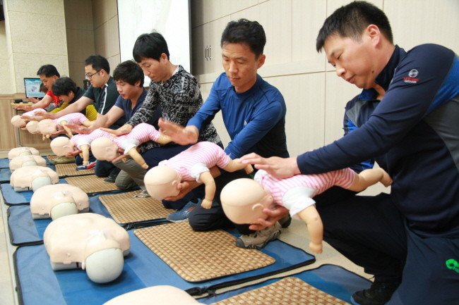 지난 22일 서울 구로구 구로소방서가 공원로6가길 대한산업안전협회 중앙교육장에서 전국의 건설산업체 안전관리자 31명을 대상으로 재해발생시 응급처치 실습교육을 실시했다. 사진은 이날 교육에 참가한 직원들이 응급처치 실습을 하고 있는 모습. (사진제공=구로소방서)