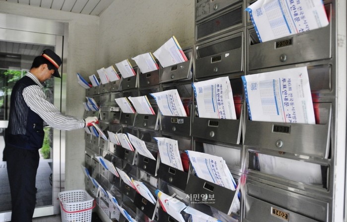 지난 25일 서울지방우정청 직원들이 제6회 전국동시지방선거 투표안내문과 선거공보 배달을 시작했다. 사진은 여의도우체국 집배원이 영등포 푸르지오아파트 우편수취함에 투표안내문과 선거공보가 담긴 우편물을 투함하고 있는 모습.(사진제공=서울지방우정청)