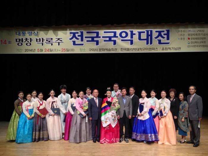 경북 구미시는 지난 25일 일반부, 고등부 등 전국에서 200여명이 참여한 가운데 이틀간 열린 '제14회 명창 박록주 전국국악대전'을 성료하고 문화예술회관 소공연장에서 시상식을 열었다. 사진은 이날 시상식에 참가한 수상자들과 대회 관계자들의 모습. (사진제공=구미시청)
