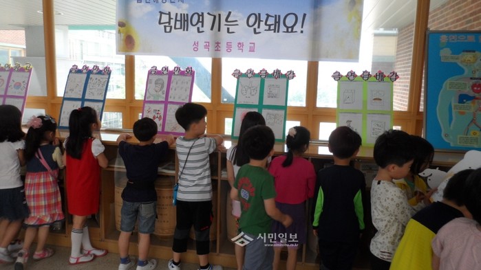 26일 경기 부천시 성곡초등학교는 금연주간을 맞아 학생흡연예방 및 금연실천 강화를 위해 교내에서 금연선포식 및 금연광고, 흡연예방만화, 금연 메이킹북 등을 선보이는 흡연예방 전시회를 실시했다. 사진은 이날 학생들이 전시회 관람에 열중하고 있는 모습. (사진제공=부천교육지원청)