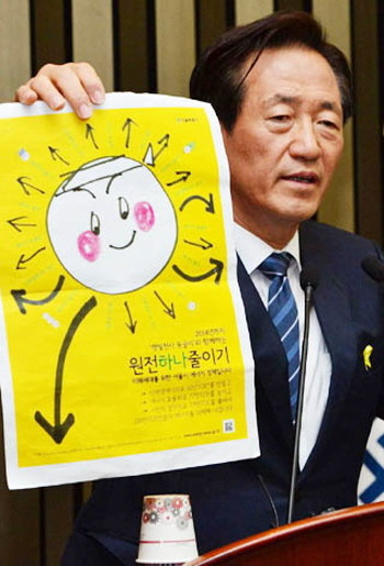 새누리당 정몽준 서울시장 후보자가 27일 오전 서울 여의도 국회 246호 회의실에서 열린 새누리당 의원총회에 참석해 원전 줄이기 포스터를 들고 박원순 후보자 관련 이야기를 하고 있다.