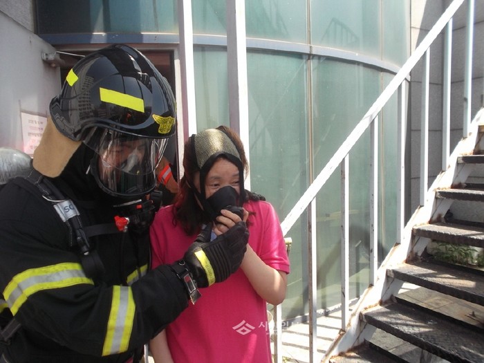 최근 인천시 남동소방서 간석119안전센터에서는 화재시 인명대피 취약대상인 의료시설에 대한 유기적 공조체제를 확립하기 위해 간석동 새희망병원에서 소방훈련을 실시했다. 사진은 이날 병원에 화재발생 상황을 가정하고 소방대원을 통해 환자대피 유도 교육을 받고 있는 병원 관계자의 모습. (사진제공=인천남동소방서)