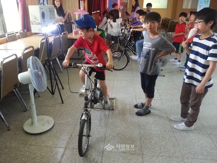 경기 이천시 이황초등학교는 학생 55명을 대상으로 경기도환경보존협회에서 운영하는 '찾아가는 녹색체험관'을 방문해 교육을 실시했다. 사진은 이날 교육에 참가한 이황초 학생들이 자전거를 타며 '자가 발전 체험'을 하고 있는 모습. (사진제공=이천교육지원청)