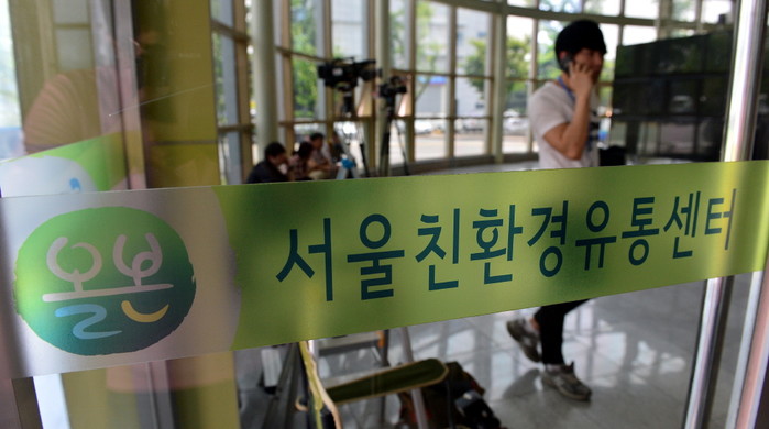검찰이 서울시 친환경 무상급식 식재료 납품과정에 비리 정황을 포착하고 친환경유통센터 등 관련 기관을 전격 압수수색한 28일 오후 서울 강서구 서울친환경유통센터에서 취재진들이 대기하고 있다.
