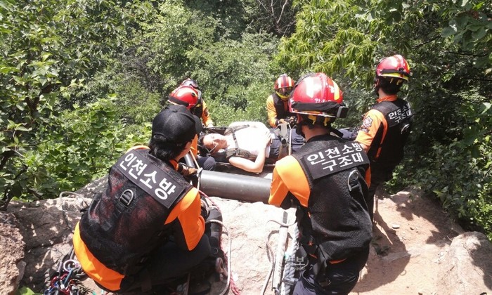 29일 오전 인천 남동소방서 119구조대가 남동구 소래산 일대에서 여름철 증가하는 산악사고에 대비해 안전한 인명구조를 위한 구조숙달훈련을 실시했다. 사진은 사고가 자주 발생하는 등산로 주변에서 사고상황을 가정해 훈련을 진행하고 있는 구조대원들의 모습.(사진제공=인천남동소방서)