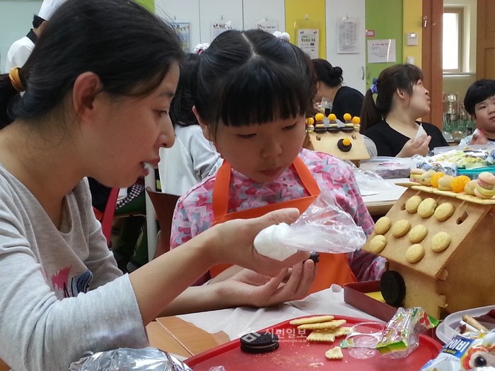 지난 28일 경기 부천시 소사초등학교 특수학급이 '재미있는 베이커리 체험- 동화속의 과자집을 만들어요'라는 주제로 학생과 학부모들을 대상으로 체험학습 행사를 실시했다. 사진은 이날 베이커리 체험프로그램에 참가한 부모와 학생들이 쿠키로 과자집을 만들고 있는 모습. (사진제공=부천교육지원청)