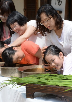단오(6월 2일)를 앞둔 29일 오전 서울 세종로 국립민속박물관에서 아이들이 창포물로 머리를 감는 단오 세시풍속 체험을 하고 있다.